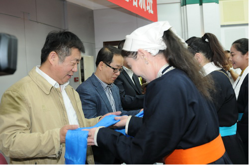 来自内蒙古自治区的新巴尔虎左旗就业服务局局长苏德代表牧民感谢食品学院的专家们多年来为蒙区农牧民搭建的奶制品深加工操作平台,以及为蒙区农牧民致富做出的卓越贡献。他说,随着互联网以及加工生产方式的变革,传统乳制品的生产和推广也面临全新挑战。目前蒙区传统乳制品企业多为中小微型,缺乏规模化经营及统一的行业标准、存在工艺技术传承方式单一、品种和口味地域差异显著等问题。他表示,食品学院是我国现代乳业加工的先驱,具备雄厚的科研实力和广泛的社会影响力,培训班更是学院以传统乳制品创新研发为依托,提升行业生产规范、科技水平以及市场竞争力为主旨的惠民行动,对改善农牧民的生产和生活质量有着重要的促进作用。希望能与食品学院进行更加广泛和深入的交流合作。他同时强调,希望学员把握难得的机会,积极参与学习和实践,共同营造互动共进的氛围。为再一次表达对学校及学院的感谢,苏德携牧民为买球赛的app官网领导敬献哈达。