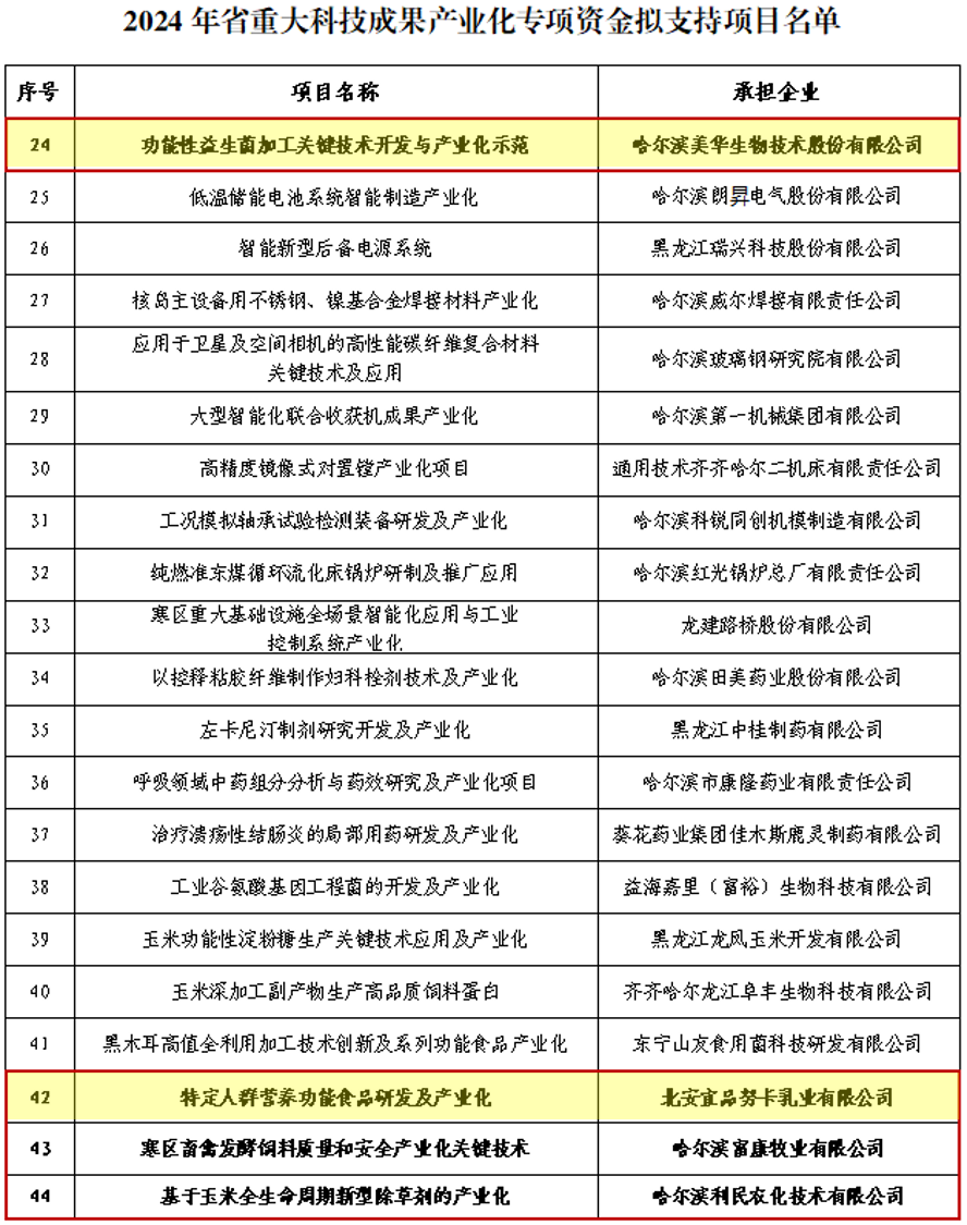 近日,黑龙江省科学技术厅发布了关于2024年黑龙江省重大科技成果产业化专项资金拟支持项目名单的公示,全省拟支持项目44个,其中,我院李柏良教授与哈尔滨美华生物技术股份有限公司联合申报的“功能性益生菌加工关键技术开发与产业化示范”,张微副研究员与北安宜品努卡乳业有限公司联合申报的“特定人群营养功能食品研发及产业化”2个项目获专项资金支持。