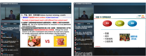 江连洲教授从植物基食品概况,产品、技术、科学问题,市场前景展望三方面与参会学者专家进行深入交流探讨。强调植物蛋白肉食品的生产加工和消费的兴起,能极大缓解畜牧业高速发展带来的资源消耗与环境保护压力,弥补我国肉类产能的不足,能够降低畜牧业激素和抗生素滥用对人体的影响,减少食物中的饱和脂肪和胆固醇,为广大消费者提供一个新的产品选择,有利于大众身体健康水平的提高。据报道,植物基食品部分替代肉类消耗,可减少温室气体的排放,与普通牛肉汉堡相比,在生产过程中可节约99%水、93%土地、90%排放以及46%能量。