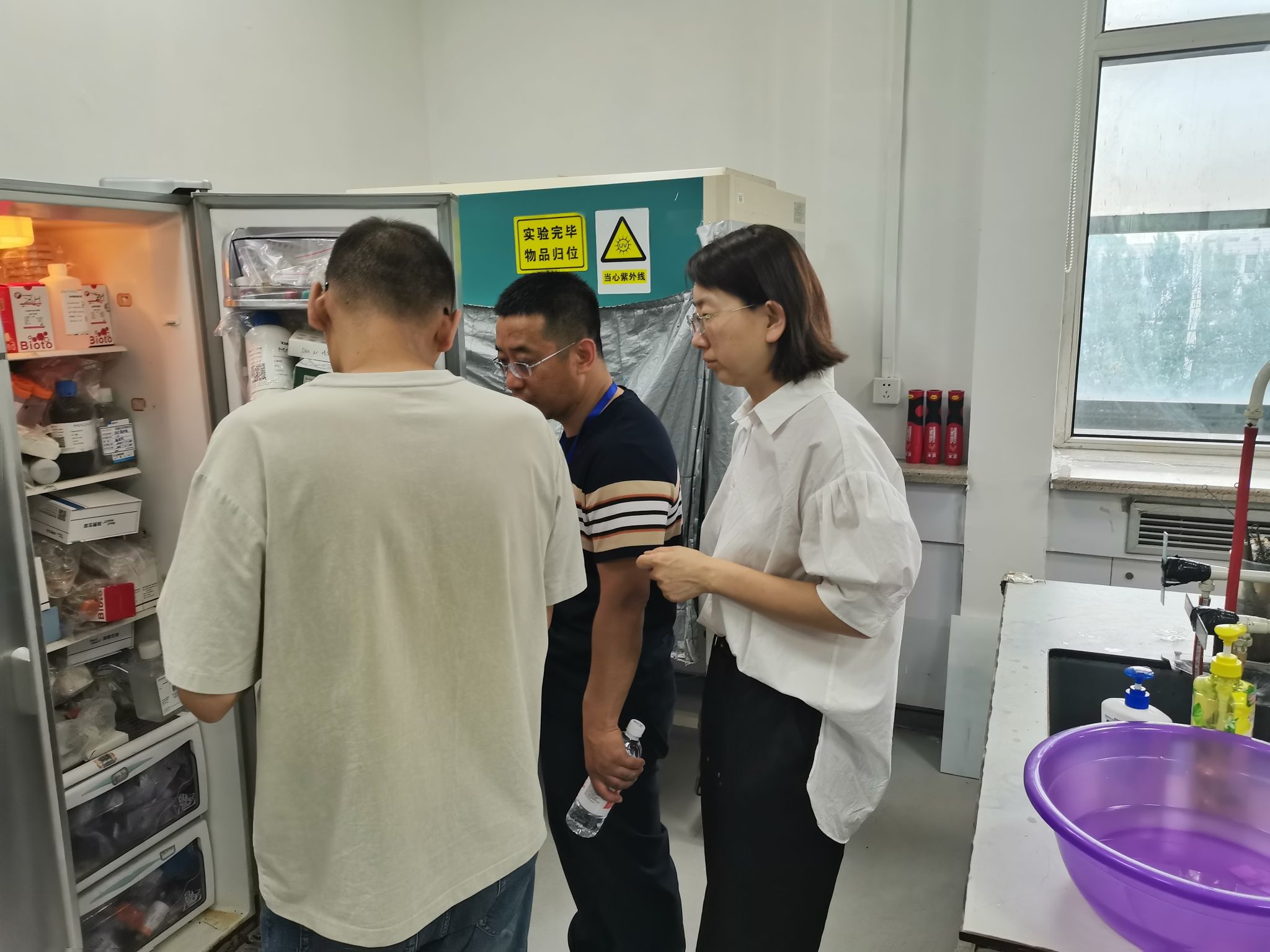 625日下午130我院副院长徐宁深入食品学院寒地黑土大楼实验室和食品楼实验室进行了实验室安全等级分类检查,同时关注环境卫生、气体钢瓶、消防安全、易制毒和易制爆危化品多方面隐患。针对检查中发现的问题,徐院长现场提出整改措施,要求相关实验室立行立改,到不留死角。