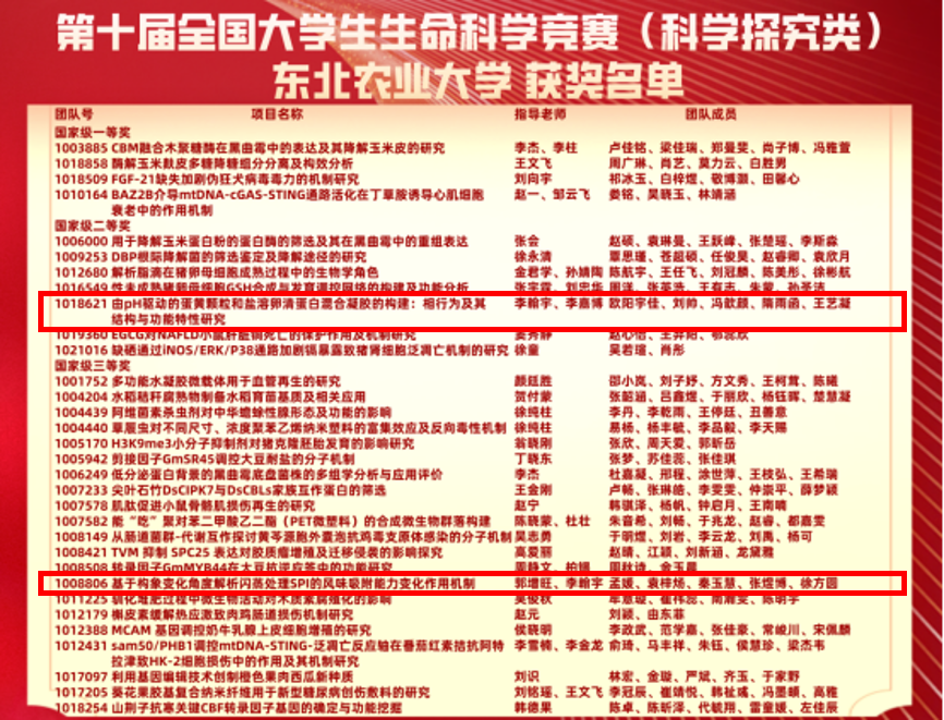 720日落幕的第十届全国大学生生命科学竞赛(科学探究类)总决赛上,我院学子表现卓越,李翰宇、李嘉博指导的“由pH驱动的蛋黄颗粒和盐溶卵清蛋白混合凝胶的构建:相行为及其结构与功能特性研究”(团队号:1018621)获得国家级二等奖;郭增旺、李翰宇指导的“基于构象变化角度解析闪蒸处理SPI的风味吸附能力变化作用机制”(团队号:1008806)获得国家级三等奖。