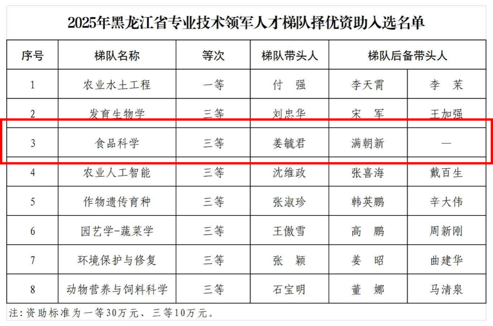 近日,黑龙江省人力资源和社会保障厅公布2025年黑龙江省专业技术领军人才梯队择优资助名单。我院姜毓君为梯队带头人、满朝新为梯队后备带头人申报的食品科学梯队经梯队申报、学校遴选推荐、省厅专家评审等程序,在全省众多申报梯队中脱颖而出,获得三等资助。