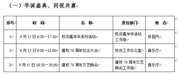 (一)建校70周年纪念大会,时间:9:00—11:00,地点:音乐厅。