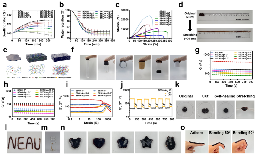 通过梯度调控金属-配体键的密度,实现了对水凝胶机械性能(如拉伸性能高达380%)、溶胀行为和流变学特性的可控调节,以满足大豆蛋白在多种应用中的多样化需求。研究发现,Ag+浓度为5 mg/mL时,水凝胶内部呈现出牺牲键和刚性化学键之间的平衡状态。而当Ag+浓度为1015 mg/mL时,牺牲键为主导作用。当施加高应变时,刚性的可逆共价键会断裂,从而降低拉伸应力。当Ag+浓度进一步增加到3040 mg/mL时,蛋白质开始聚集,导致凝胶网络结构容易断裂,这使得水凝胶失去了其延展性和承载能力。此外,该水凝胶还展现出卓越的自愈合能力、良好的粘附性和可注射性,具备显著的抗菌性能、抗炎效果、调控巨噬细胞极化的潜能和优异的生物相容性,能有效促进细胞迁移、血管新生和胶原沉积,显著加速伤口愈合过程,展示了其作为先进生物材料的巨大应用前景。