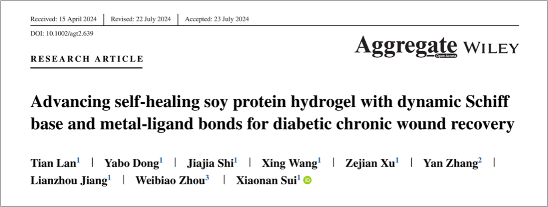近日,我院江连洲教授团队隋晓楠教授课题组在期刊Aggregate(中科院一区,IF=13.9)在线发表了题为“Advancing Self-Healing Soy Protein Hydrogel with Dynamic Schiff Base and Metal-Ligand Bonds for Diabetic Chronic Wound Recovery”的研究论文。本研究成功开发了一种基于动态化学键交联的新型大豆蛋白基水凝胶,在推动植物蛋白高值化应用领域展现出巨大的潜力和广阔的发展前景。东北农业大学为本文的第一署名单位,这是学校首次在该期刊上发表论文,东北农业大学隋晓楠教授为通讯作者,兰天副教授为第一作者。