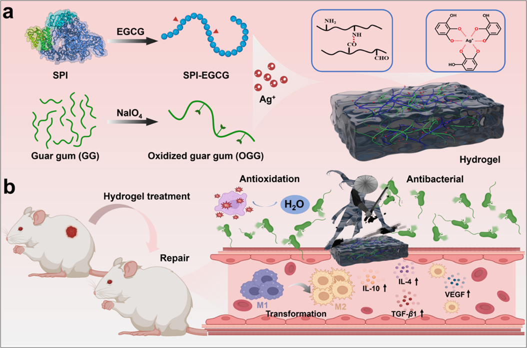 a)大豆蛋白基水凝胶通过动态席夫碱键和金属-配体键形成示意图,(b)大豆蛋白基水凝胶促进创面愈合示意图