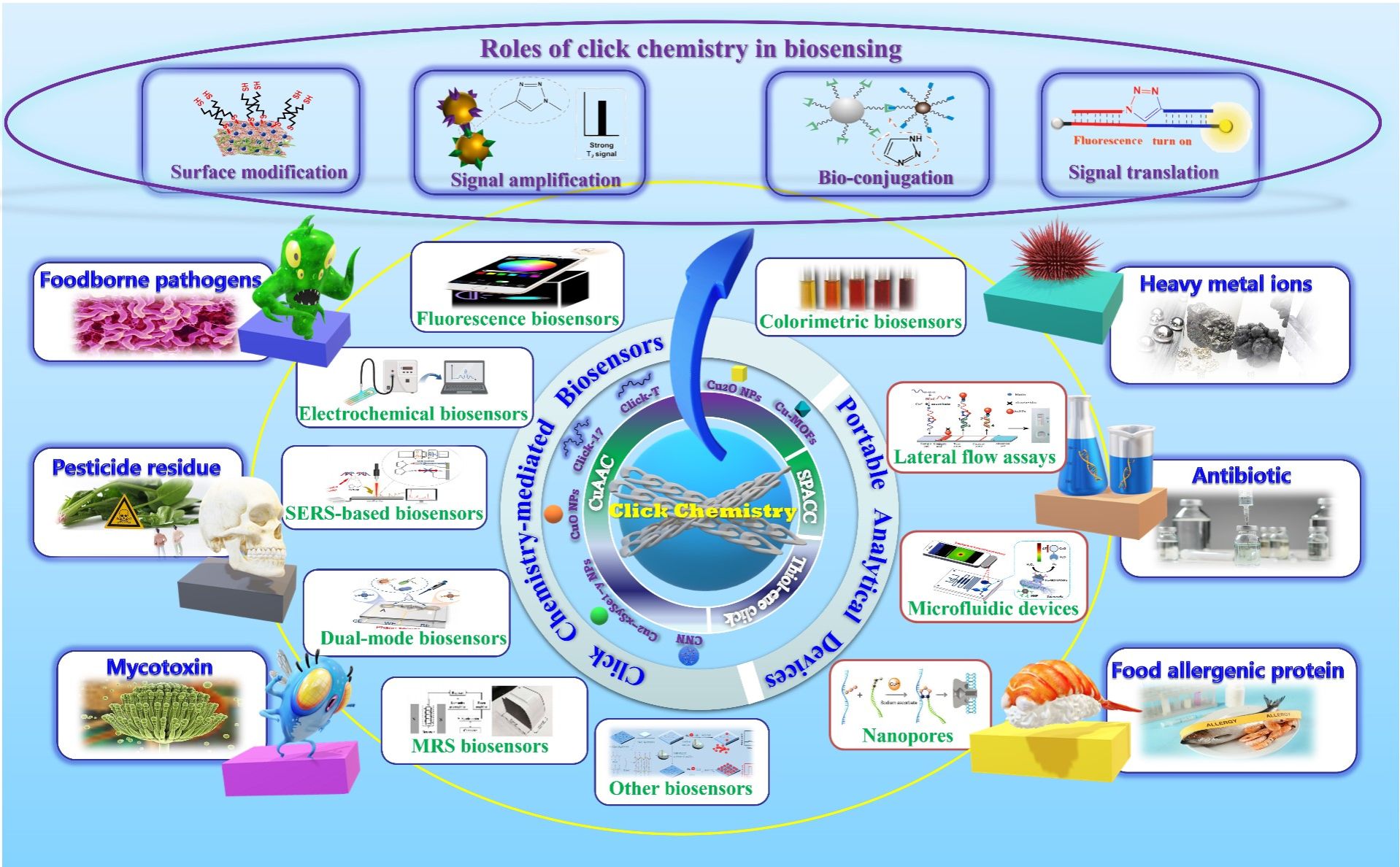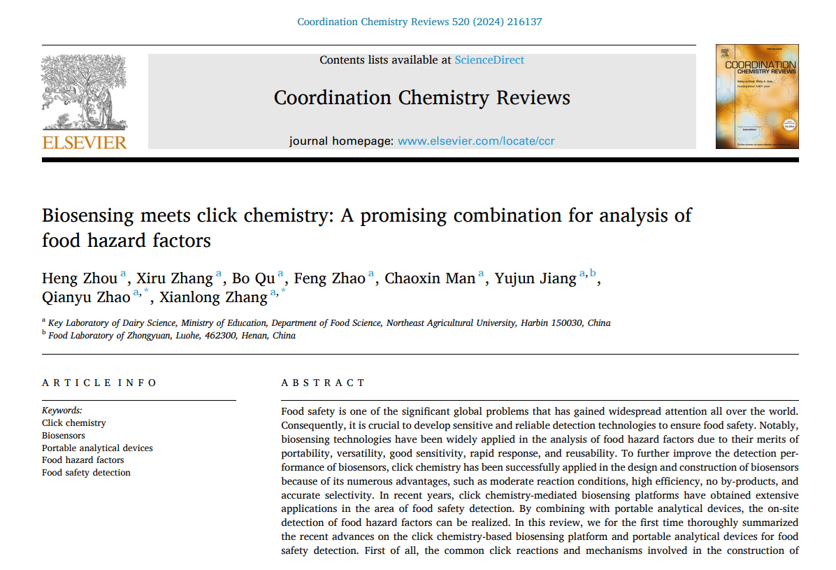 近日,我院食品安全品质与营养健康团队在国际权威学术期刊Coordination Chemistry Reviews上(中科院1区期刊,最新影响因子20.3)发表题为“Biosensing meets click chemistry: A promising combination for analysis of food hazard factors” 的论文。这是学校首次以第一通讯单位在此期刊发表论文,姜毓君教授指导的2023级硕士研究生周衡为第一作者,团队青年教师张现龙和赵倩玉为通讯作者。