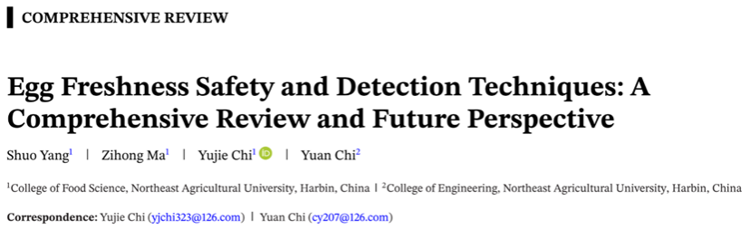 近期,我院迟玉杰教授、工程学院迟媛教授在国际权威期刊《Comprehensive Reviews in Food Science and Food Safety》(中科院一区TOP,IF: 14.1,IF5: 17.8)联合发表题为“Eggfreshnesssafety anddetectiontechniques: Acomprehensivereview andfutureperspective”的综述论文。迟玉杰教授和迟媛教授为通讯作者,博士研究生杨硕为第一作者,该工作得到了“十四五”国家重点研发计划项目的支持。原文链接:https://doi.org/10.1111/1541-4337.70317。
