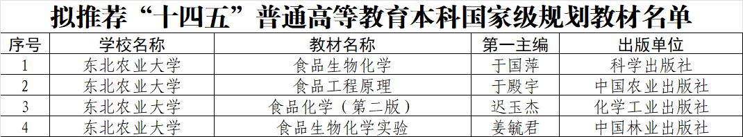 于国萍主编的《食品生物化学》,于殿宇主编的《食品工程原理》,迟玉杰主编的《食品化学(第二版)》和姜毓君主编的《食品生物化学实验》拟获“十四五”普通高等教育本科国家级规划教材参评推荐。
