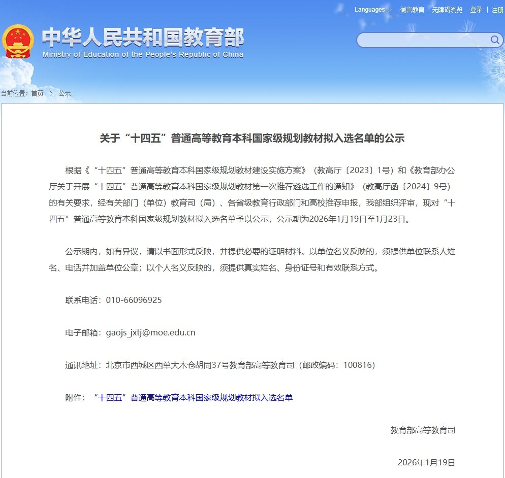 近日,教育部高等教育司和黑龙江省教育厅公示了“十四五”普通高等教育本科国家级规划教材入选名单和黑龙江省拟认定“十四五”普通高等教育本科省级规划和拟推荐国家级规划教材名单,我院10部教材成功获认定与推荐。