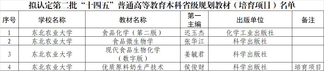 迟玉杰主编的《食品化学(第二版)》,张华江主编的《食品微生物学》,姜毓君主编的《现代食品生物化学(数字版)》和侯俊财主编的《优质原料奶生产技术》入选“十四五”普通高等教育本科省级规划教材。