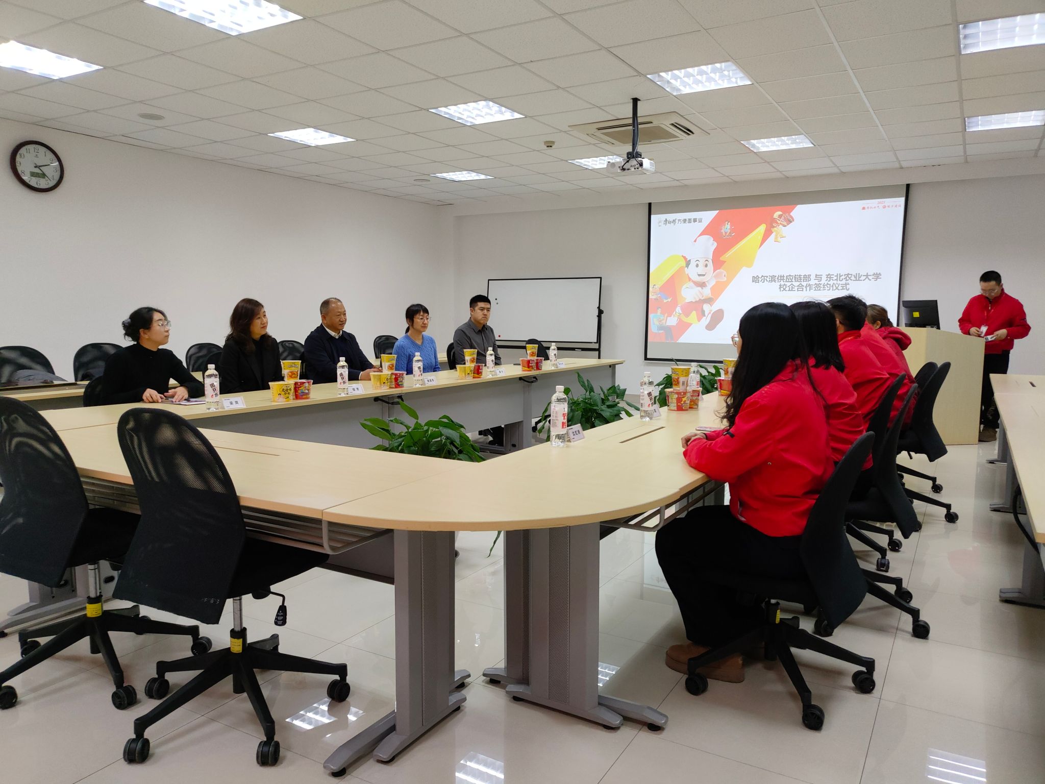 12月25日,我院党委书记施喜军、党委副书记钱芳、食品科学与工程系主任夏宁及2022级辅导员高忠琦、梁爽一行5人,赴哈尔滨顶益食品有限公司(康师傅)深入开展访企拓岗与校企合作交流活动。哈尔滨顶益食品有限公司厂长翟增翼、人资处处长苏聪、制面处处长周凯、品质管理处检验科科长边凤兰等企业负责人共同参加座谈交流。